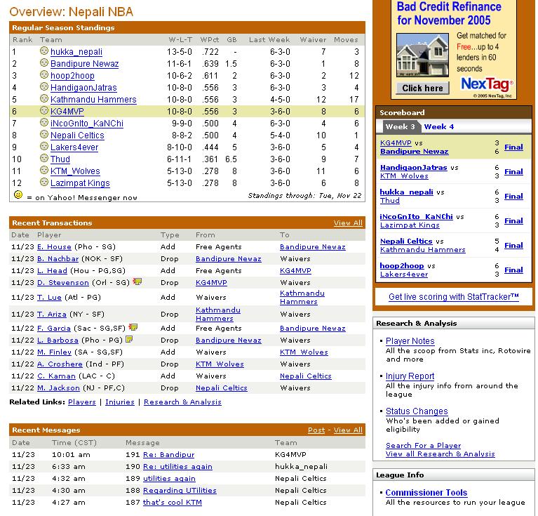 will do from next week... unkown I thought you had the lineup, what's going on??? your team seems to be below avg on every category :=) how about trade??? M. Bibby is avail i read somewhere that KG wants outta Minny..... he seems to be interested playing at Madison Square Garden, The Mecca of Basketball..... NYers deserve a superstar like him... but I don't think KG is the player who will take your team to PRMOISELAND... he is a great player but I don't think he makes players around him better. Same thing goes with Kobe and Stephon Marbury, the best PG in the league :p How akward will that be to see Steph and KG sharing the court again.... and here's the million dollar Q, how much knicks going to pay him? we all know Knick like to overpay for every players they acquire.... If i get to vote I say NO to combo of Steph and KG I know lotsa Wolves frequent this site...... so spare me being critical of KG How about the best team in LA, THE CLIPPERS ;) ya ppl didn't believe me, did ya