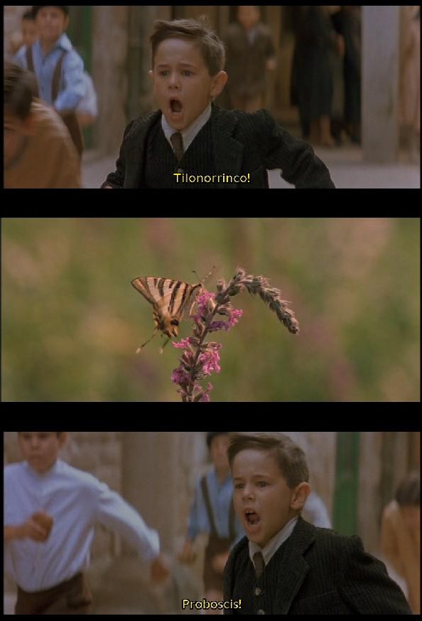 In my view, this the finest moment of the movie. Mark the strange words Moncho uses to denounce his teacher. These two words that come from two symbolic moments during the movie transcends politics, penetrate psychology and touch the soul of the boy and perhaps of us.