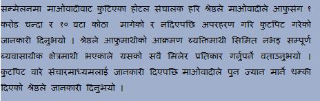 Daum. you are trying to justify beating of businessman by maoist. Shame on you. And do you think you beloved maoist beat him because he made black money. Hell NO. They beat him because they couldnot extort money from him. Do you think maoist have extorted and intimidated only businessman who have black money . Again no. They have threatned every businessman. They havent even left small shops in many places.