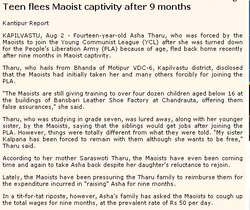 There were few intellectuals who were very vocal that maoist had contributed so much for Nepalese .They were stressing that Maoist created awareness and all.But what was ultimate contribution of Maoist to welfare of Nepal? They hadn't imagined this :more than dozen seperate armed outfit following the successful path led by maoist. http://kantipuronline.com/kolnews.php?&nid=115538 I always said may be the objective was good but the path adopted was bad.In one of the thread "Terrorism" . One year ago , this debate was going on Whether to call these people terrorist or liberation army.Now , questions to these individual who supported Maoist cause like looote kukur and others .Don't you think JTTM sss ,Cobras and tigers a are freedom fighters?Do you equally have respect for these people newly mushroomed freedom fighters and why shouldn't we fulfill their demands and not divide your Nepal (which you love so much) cause you will still be reiterating that they are freedom fighters. Now , Nepal is in the verge of disintegration due to racial propaganda by maoist backfired . Do you still believe it was great contribution?? If you haven't had enough of Nepal and consequences of maoist freedom fight, There are more to come as i had predicted .wait and see.