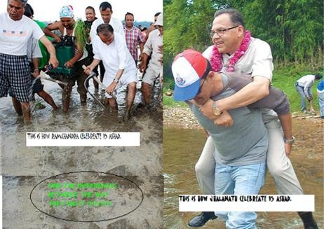 यी दुई नेता हरु नेपालका दुई प्रमुख पार्टी हाकेर देश लाई नेत्रित्व दिने सपना देखिरहेका छन। यिनीहरु ले किसान लाई देख्ने दिन भनेको १५ आशाद नै होला । तर पनी यि दुई ले १५ आशाद मनाएको तरिका म केही फरक देख्नु हुन्छ भने मलाई भन्दिनुउस न है !!!