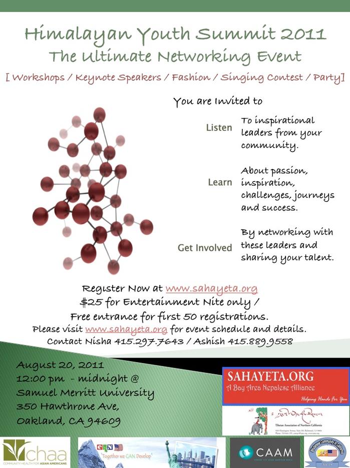 This collaboration of agencies (Sahayeta, CHAA, TANC, BCC, CAN-USA, and CAAM) are glad to now announce the first annual Himalayan Youth Leadership Summit, to be held on August 20, 2011, at Samuel Merritt University in Oakland.