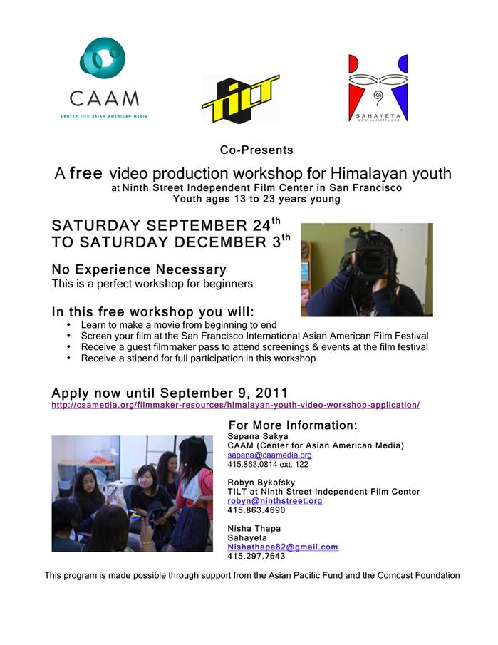 Center for Asian American Media (CAAM), TILT & Sahayeta.org is doing a free 10 week video production workshop for Himalayan youth.  The deadline for application is from Sept. 9th and the course will be every Saturday from Sept. 24th through Dec. 3rd. The films produced during this workshop will be screened at the SF Int. Asian American Film Festival and be screened for the community. Youth participants will be given a stipend at the end of their training.