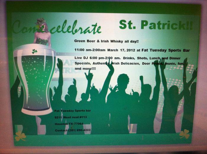 Green Beer all day, Live music from 6:00 pm-2:00 am, Authentic Irish Delicacies, Door Prizes all day long, games, & more!!!!