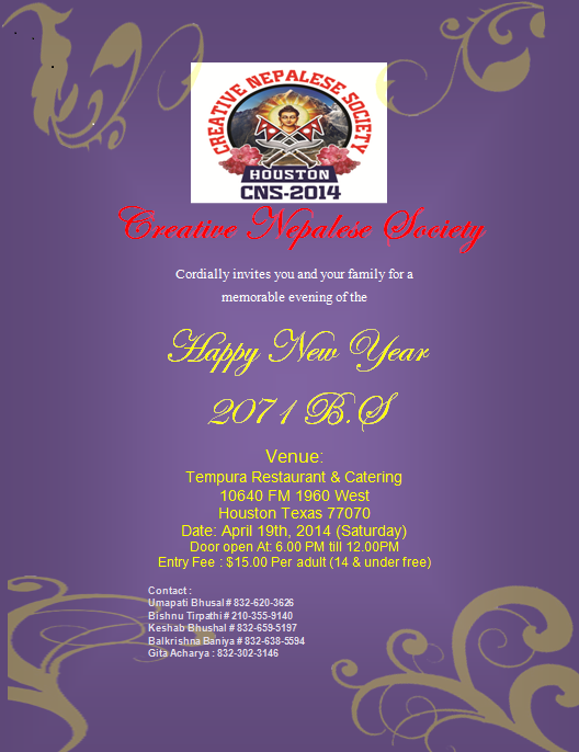 We would like to invite all the nepali brothers and sisters of Houston to attend this new year celebration evening to share the wishes, reunite with the friends and family and enjoy the cultural programme. For more details please contact