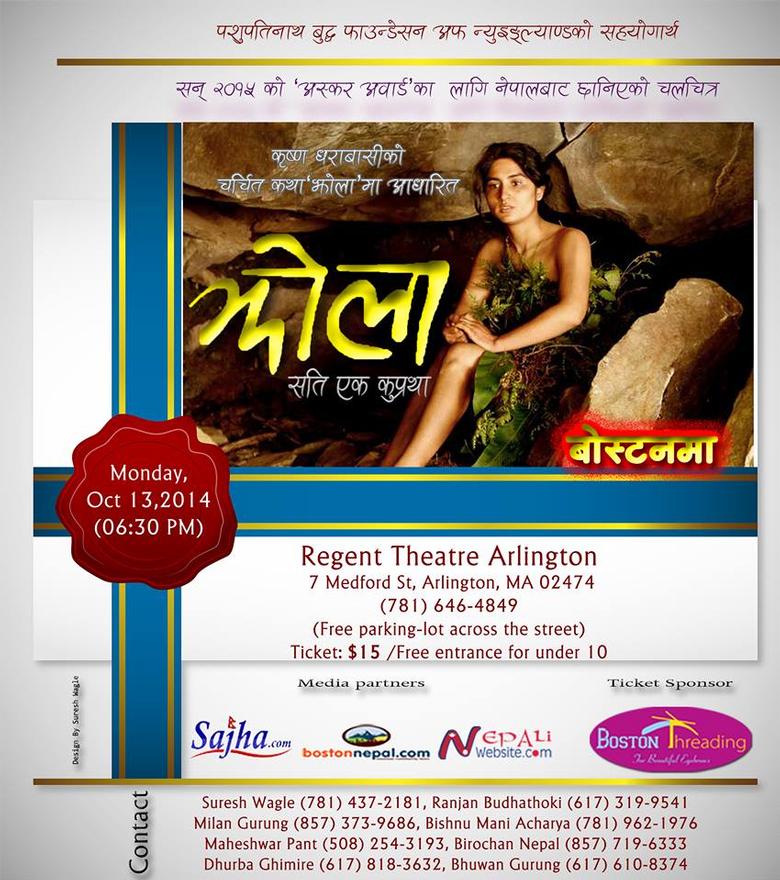 'पशुपतिनाथ बुद्ध फाउन्डेसन अफ न्युइङ्ल्याण्ड'को सहयोगार्थ सन् २०१५को 'अस्कार अवार्ड'का लागि नेपालबाट छानिएको कृष्ण धराबासीको चर्चित कथा 'झोला'मा आधारित नेपाली चलचित्र 'झोला' को प्रदर्शन । साथमा चलचित्र लेखक तथा चर्चित साहित्यकार कृष्ण धराबासीसङ्ग साक्षात्कार ।