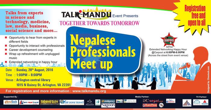 Hello EveryoneGreetings from Talkmandu TeamThis is a cordial invitation to attend a one day 'Nepalese Professionals Meet up' event on Sunday, 28th August 2016, at the Arlington central library, Arlington, VA organized by Talkmandu Events. The main objective of this event is to bring together and build an exemplary networking between Nepalese professionals living and working around the DC metro area (MD, VA and DC) with the aim to serve the entire Nepalese diaspora in the area. The event format will include 6-7 talks (30 min each) by Nepalese experts working in different fields, followed by an open floor discussion. We have already confirmed speakers from Medicine, Biomedical Research, Business, Law, Technology and the Media. .This event is the lead off for this area. The inspiring stories of our speakers and the one on one interaction would certainly help to bring new dimension in your professional career and your presence would encourage us to organize similar events in future.For further details please check our website:www.talkmandu.org